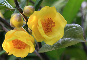 這棵高約三米,樹(shù)干直徑約五公分的就是金花茶了。只見(jiàn)點(diǎn)大的金花、瘦弱的樹(shù)干毫不惹眼。但湊近觀賞,會(huì)發(fā)覺(jué)金花茶金瓣玉蕊、鮮麗俏艷,綠葉臘質(zhì)金黃、晶瑩光潔,綠葉上泛有淡微清香。