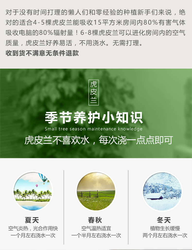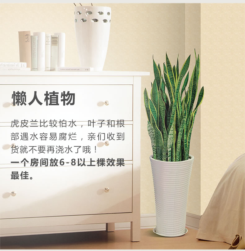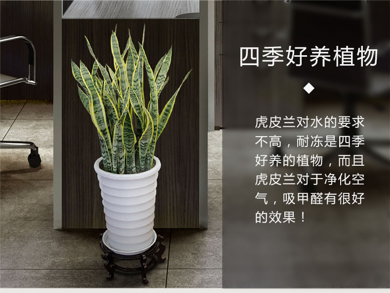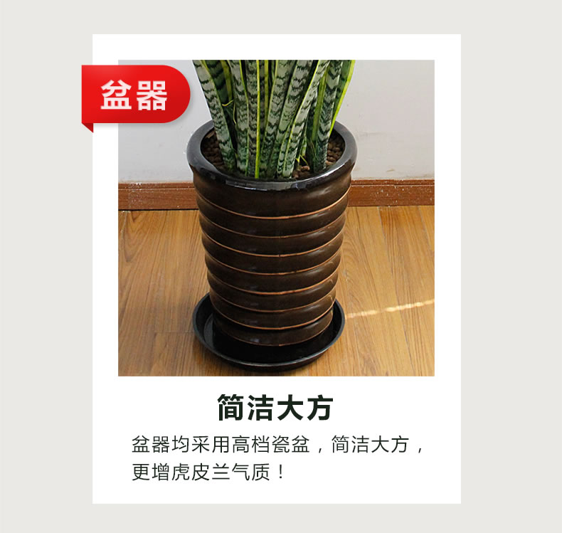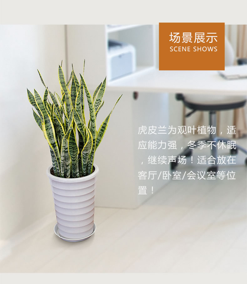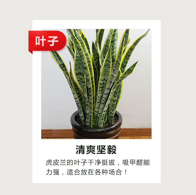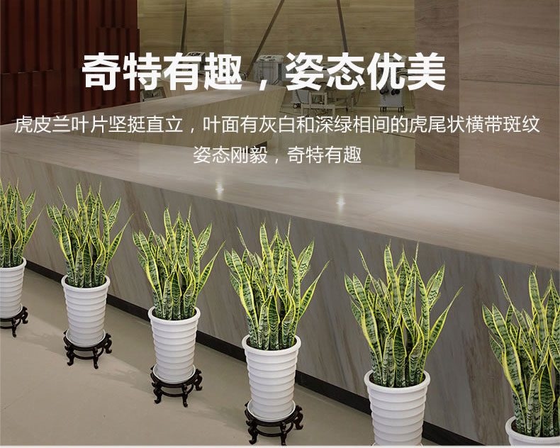 虎皮蘭又名虎尾蘭、千歲蘭, 為百合科、虎尾蘭屬多年生常綠草本植物,根莖呈匍匐狀生長,無莖。植株高度可達1米左右,葉片叢生并直立,肥厚革質(zhì),兩面均有不規(guī)則的暗綠色云層狀橫紋,如虎尾而得名。有橫走根狀莖。葉基生,常1~2枚,也有3~6枚成簇的,直立,硬革質(zhì),扁平,但家庭中栽培常不見花開,以欣賞葉片為主。