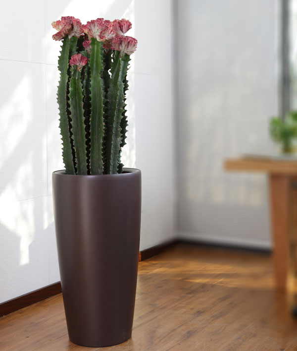 繁殖多用扦插,龍骨為多漿植物,扦插時剪下會流出漿液,可用草木灰封閉,放涼處7天至10天,待植株萎縮后再扦插。 一種是將龍骨切段扦插,上下切口均應用草木灰封閉,插穗長度應為20厘米至25厘米。 另一種是從龍骨枝上拿下的分枝,晾曬后即可扦插,但太小幼嫩的不易生根,這種插穗只有生根處有小傷口,扦插生根快。 扦插龍骨基質(zhì)需用蛭石、珍珠粉粒、純河沙,不摻土??蓡沃昵げ?,也可多株集中扦插,插后澆水,只澆至插穗切口處,放陽光充足地方。生根期盡量少澆水,不干不澆,待30天至40天,即可生根。 生根后進行移栽,盆土要求1/2河沙和1/2壤土混均后栽入,用2%高錳酸鉀水澆入,既做了土壤消毒,又澆了水,植株高的可用支棍綁縛固定。培養(yǎng)時放陽光充足處,仍需控制水量,寧干勿濕為佳。 龍骨柱多種多樣,有叢狀形,三柱形,九柱形等。作者認為九柱形和十二柱形蔚為壯觀,整形具體做法為: 九柱形植株生長到20厘米至30厘米時,用利刀將頂端削去,立即用草木灰封住,待植株生長出分枝后,只保留頂端的三個分枝,要求每角一個,其余抹去。第二層再長到25厘米至30厘米時,再將頂端削去,分枝生出后仍選三個分枝,每角3個,即1、3、9形的龍骨。 十二柱形選角方法同上,只是在9柱形生長到20厘米至30厘米時,削去頂端,再培養(yǎng)三個分枝,每角選1個或3個。其余小分枝,隨長隨抹去,保持樹形一致。 叢柱形植株長到40厘米至50厘米時或30厘米至40厘米時削去頂端,讓其自然生長,形成多頭體的龍骨,但選留應有序,不可紊亂。 龍骨柱生長高度達2米至3米時,形成眾多枝頭,易造成頭重腳輕不穩(wěn)固,所以應及時綁支棍加以固定。 龍骨柱需陽光充足,枝體呈藍綠色,葉片似魚鱗,在陽光照耀下會閃閃發(fā)光,眾體林立,群峰利劍,很是壯觀,是盆栽花卉的佳品。 龍骨柱不耐寒,但耐旱,喜干燥壤土,北方冬季應置于室內(nèi)蒔養(yǎng),南方可露地栽植,也可用做籬笆,既是綠色屏障,又可美化庭院,夏季還能觀賞到花香和果實。