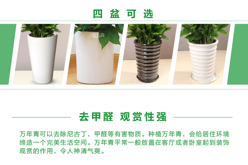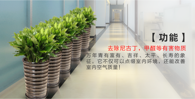 萬年青適宜點綴客廳、書房。裝飾應用:幼株小盆栽,可置于案頭、窗臺觀賞。中型盆栽可放在客廳墻角、沙發(fā)邊作為裝飾,令室內充滿自然生機。 以它獨特的空氣凈化能力著稱:可以去除: 尼古丁,甲醛 ??諝庵形廴疚锏臐舛仍礁?,它越能發(fā)揮其凈化能力!