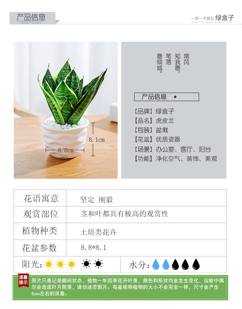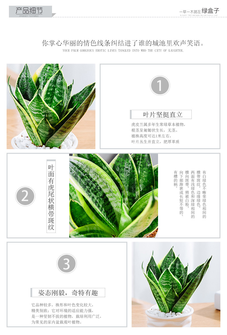 虎皮蘭放置在辦公室或者家中,除了可以起到觀賞的作用外,還可以吸收屋內(nèi)的甲醛等有害物質(zhì),增加室內(nèi)負(fù)離子濃度,降低其對(duì)員工、家人的傷害。特別是新裝修的房屋,或新購(gòu)置家具后,效果更明顯。